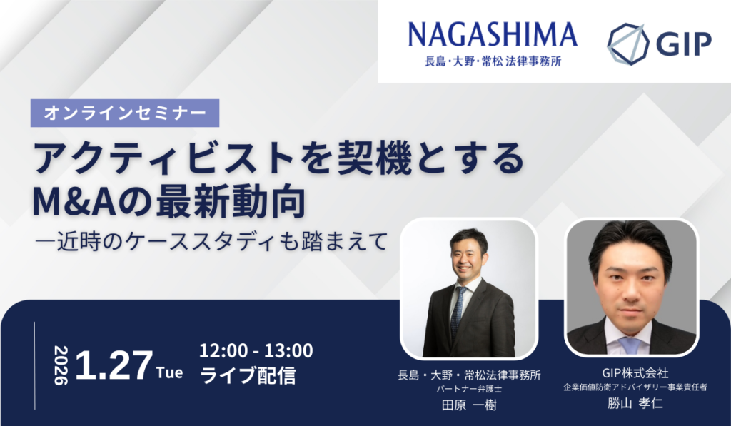 このたび、長島・大野・常松法律事務所との特別セッションとして、「アクティビストを契機とするM&Aの最新動向~近時のケーススタディを踏まえて~」と題するウェビナーを開催することとなりましたので、ご案内いたします。