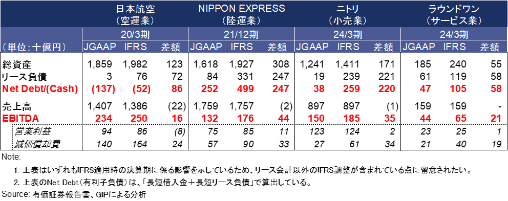 対象とした日本航空、NIPPON EXPRESS、ニトリ、ラウンドワンの4社は、リース取引の多い事業形態であることから、使用権資産の計上やリース負債の増加が総資産や負債額の増大として表れます。IFRS適用企業の財務情報は、日本基準の新リース会計基準を適用した場合の財務指標の変化を推測する際の有用な参考事例となります。