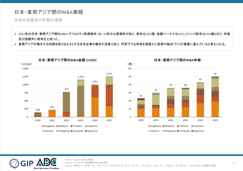 - 2025年の日本・東南アジア間のM&A(マジョリティ取得案件)は50件で前年比16%増、金額はUS$1,257Mで前年比24%増となり、件数・金額ともに前年を上回った