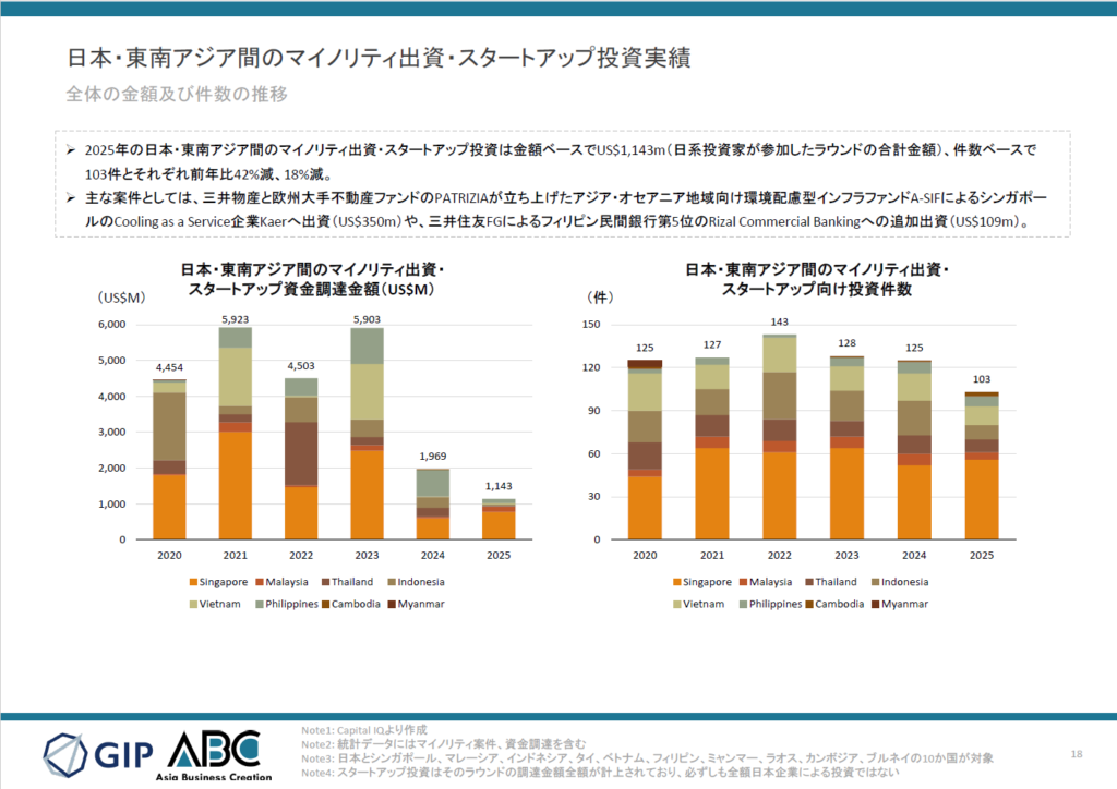 - 2025年のマイノリティ出資・スタートアップ投資は103件で前年比18%減、金額はUS$1,143Mで42%減となった