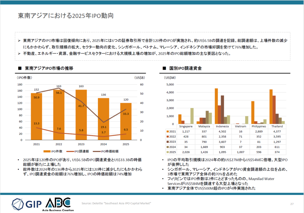 - 東南アジアのIPO市場は回復傾向にあり、2025年は120件のIPOが実施され約US$6.5Bを調達