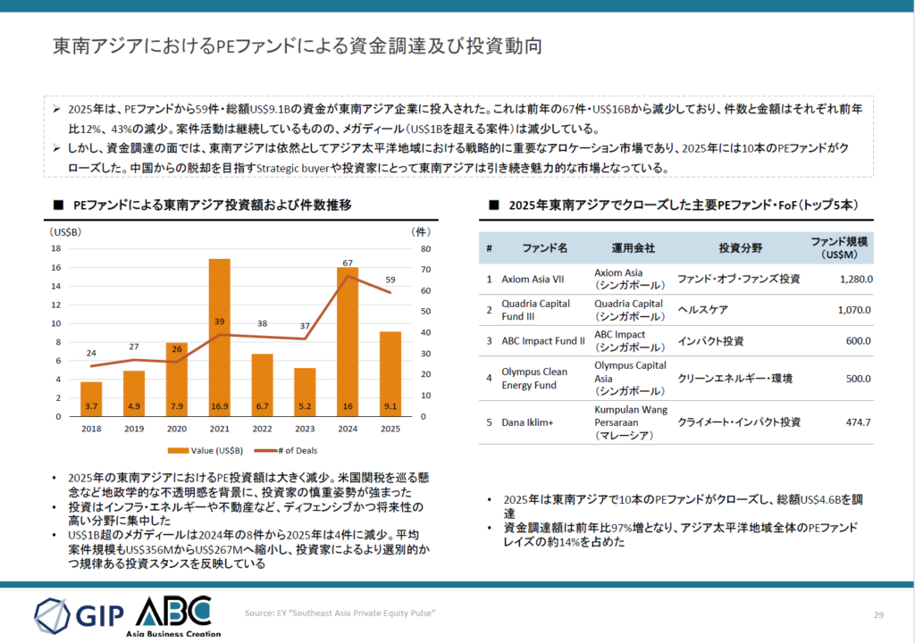 - 一方で、東南アジアは依然としてアジア太平洋地域における戦略的投資先であり、2025年には10本のPEファンドがクローズし総額US$4.6Bを調達するなど、資金調達面では引き続き活発な動きが見られた